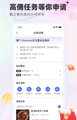 1、霸王餐吃喝玩乐应有尽有,各种高佣金任务等你申请,一键分享轻松赚外快;