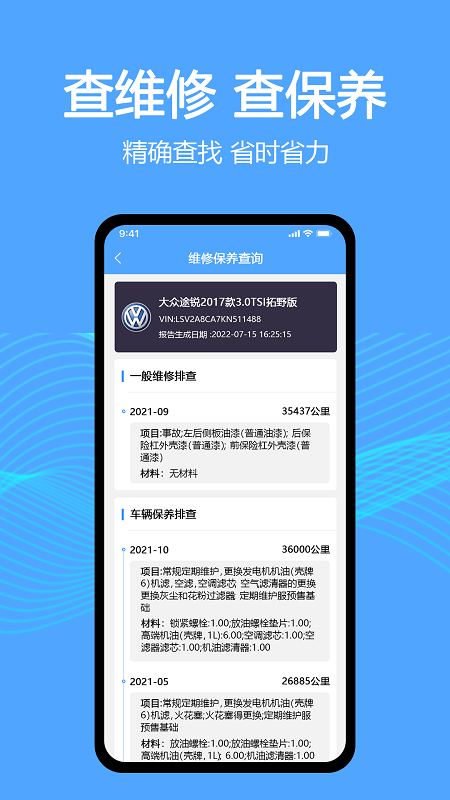 车辆维保记录查询是便捷的管理服务平台。这里让用户的驾驶生活变得方便、包括品牌、车系、车型、年款、厂商指导价格等信息。免费为司机和货主提供货源,实现专家人工解读报告、现场验车指导的运营方式。提供车辆违章查询、驾照计分查询、车辆出厂信息等业务,了解到自己的汽车保养情况。