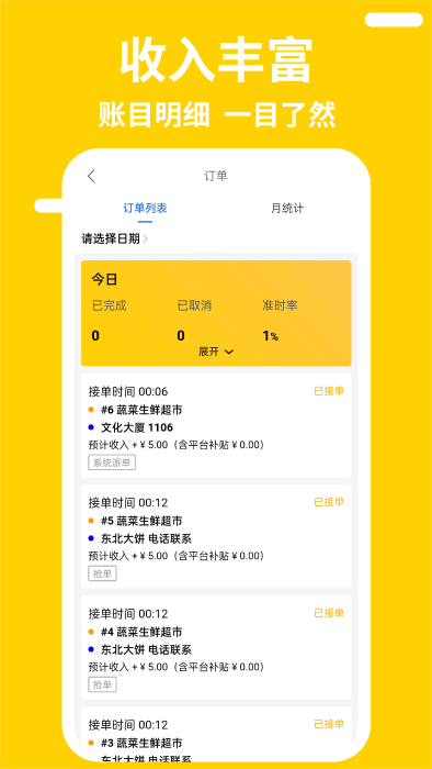 1、帮助骑手更加快速的进行抢单,所有的收益明细都可以查看。