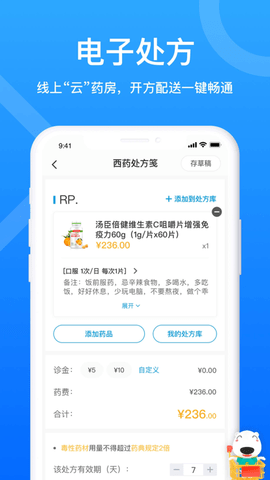 2、电子处方,医生在线“云”药房,药品齐全,送货上门,诊疗处方。