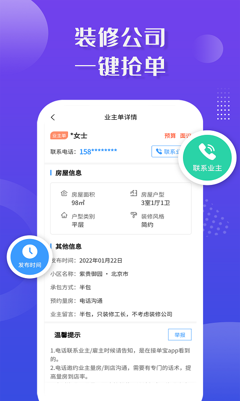装修接单宝是一款非常好用的装修抢单软件,软件中业主可以在手机上发布他们的需求,等待合格的装修师自动收到订单,很快,一家公司或团队就会找到你,任何问题都可以通过手机直接在线沟通,降低沟通成本,快速解决需要装修的房屋,功能强大,需要的话就快来下载试试吧。