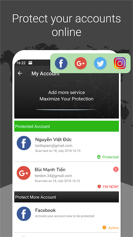 3、保护你的Facebook, Gmail, Instagram, Twitter账户。检测和防止未经授权的访问从您的网上帐户窃取数据。跟踪日志活动有助于检测可疑的访问,并提供解决方案,以保护您的在线帐户。