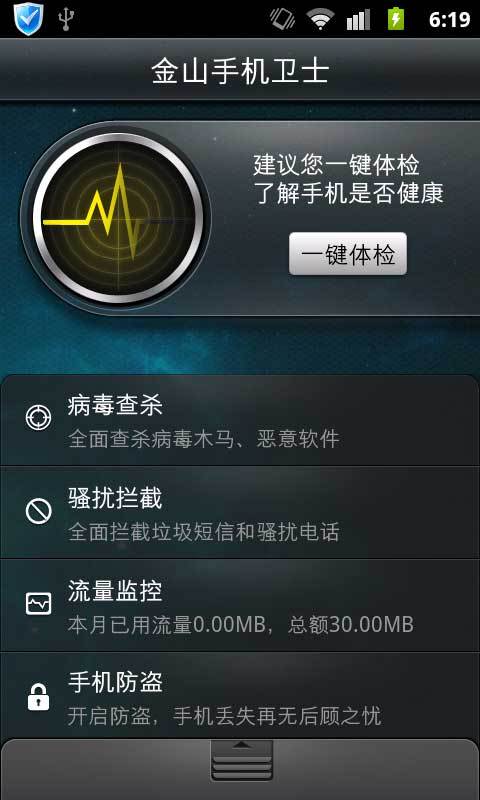 金山手机卫士是一款手机保护软件。防骚扰垃圾短信、诈骗短信精准拦截、诈骗电话、响一声来电精确过滤、防病毒扣费软件、吸流量软件彻底清除、最新恶意软件第一时间预防拦截、隐私保护、隐蔽空间,密友通讯自己掌握,全面自定义来电短信提醒方式。查健康,一键任务管理,及时省电,流量实时监控,节流省钱。