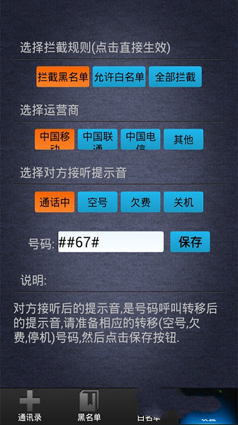 安卓来电防火墙,使用它您可以通过设置黑名单的电话号码、短信关键字、电话区域,来达到屏蔽骚扰电话和短信的目的;同时用户可以设置白名单保证特定号码电话或短信的接收。