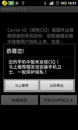 关于CIQ程序:全名carrier IQ,是一款由运营商内置在手机中,用于收集用户使用行为数据,来改善服务体验的工具。但CIQ却收集了包括用户短信内容、地理位置、搜索记录和键盘输入在内的重要隐私信息并回传。360安全中心全球首家推出查杀工具,彻底查杀CIQ,保障广大用户的隐私安全。
