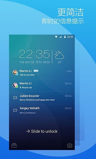 直接在锁屏上显示实时通知消息(微信、QQ、短信等),免除频繁解锁查看消息的烦恼。