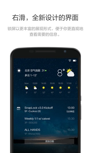 Snap效率锁屏(豌豆荚锁屏)是由豌豆荚推出的一款安卓锁屏软件,它的性能跟它的的名字是一样的。Snap 效率锁屏是一款简单却又能大幅度提高效率的工具,拥有它,手机将会知晓你需要的一切。你无需再浪费时间解锁翻找 app 、翻找信息,在这里,需要的信息都将在锁屏优雅直观地呈现好,你仅需拿起手机便可进行查阅处理。