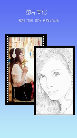 支持图片的裁剪,旋转,加照片框,做各种特效。比如试试独特的素描特效。