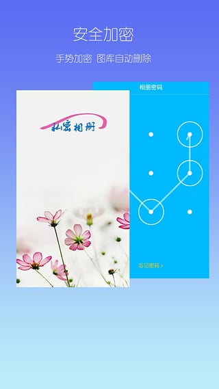 想隐藏图库中的私密照片吗?最安全的私密相册来帮您!私密相册支持手势图像加密。加密后,私密照自动从图库相册删除,保障照片安全。除此以外,私密相册还具有很多强大的功能。