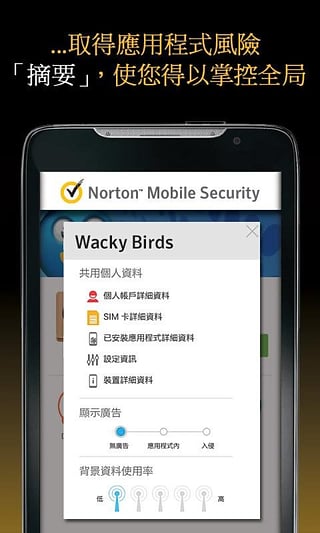 诺顿出品的手机防毒软件值得信赖,诺顿手机安全软件主要提供有三项功能,包括设备远程锁定和数据清空,主要用于手机丢失后防止数据泄漏,可疑来电过滤功能可以将骚扰电话进行 拒接,另外这款软件还提供有恶意软件扫描功能,避免手机遭遇木马软件侵袭。