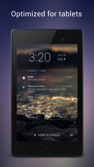 回声锁屏是最小,最快,最简洁的锁屏软件,作为谷歌的最具特色的核心应用程序之一,回声受到了来自235个国家用户的青睐。 下载回声就可在锁屏的情况下接收显示安卓L风格通知,您无需打开手机就能查看重要信息。欢迎下载使用。