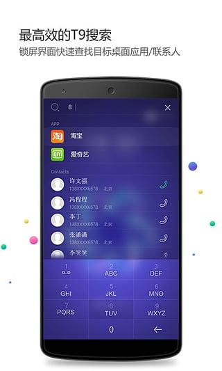 锁屏界面下滑操作,进入T9搜索,快速查找目标桌面应用、联系人。有了它,再也不用烦恼手机安了N多软件或存了N多联系人啦。