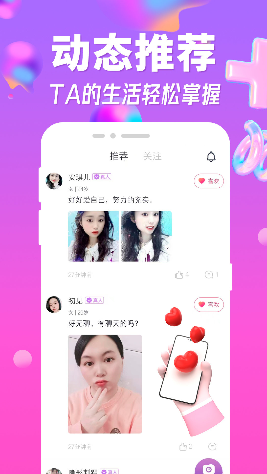 手机聊天交友app是一款超级实用的线上交友软件,软件是专门为年轻人量身打造的,里面的用户都是优质的单身人士,如果你也单身的话,在这里能很快找到自己心仪的另一半,赶紧下载吧。