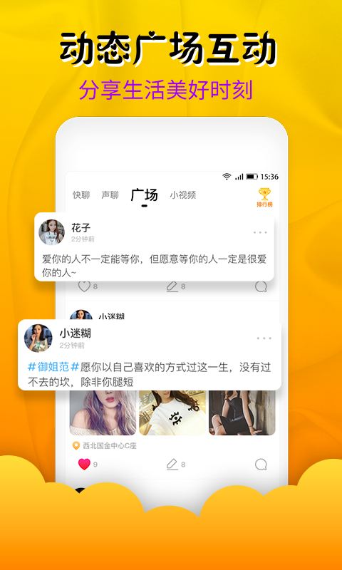 一款精彩有趣的手机互动交友软件,软件内丰富的社交互动活动用户朋友们能随意在线进行使用体验,各种好玩的交友互动活动也都是能免费提供给用户朋友们进行使用的。感兴趣的小伙伴们还在等什么,快下载吧。