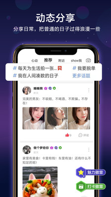 -动感广场:独家动态,展示我的魅力,浏览附近的动态,参与热门话题,发现周围有趣的人。