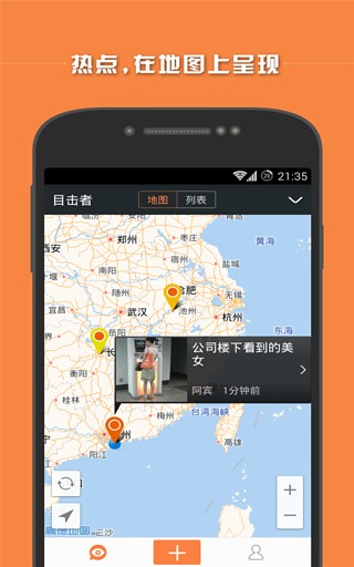 目击者是一个基于地点的“现场”公告牌。用户可以在目击者中探索、发布、讨论、分享各种“现场”,如美丽的风景,精彩的演唱会,刺激的球赛,各种突发事件,等等。目击者中的“现场”遵循马太效应:参与讨论某个“现场”的人越多,该“现场”的优先级就越高,越能被更多的用户所见。