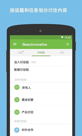 4、增加了新建、加入、置顶、退出、归档讨论组,并可查看讨论组的详情页面了