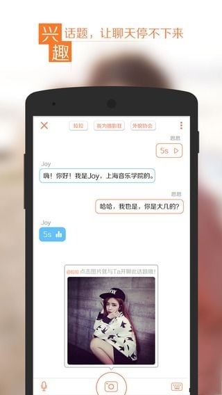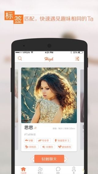 我年轻我个性,我们有自己的交友方式,不需要顾虑别人的看法,我们年轻我们就是要high,High聊app是一款专门为年轻人交友量身打造的手机交友应用,在这里大胆的说出自己的交友宣言,释放心灵,快来下载一起嗨吧。