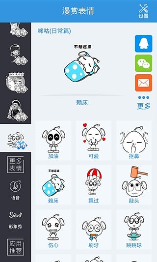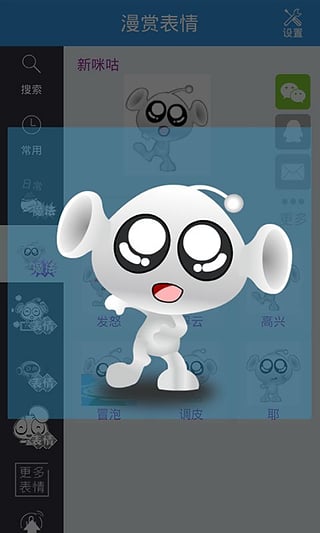 漫赏表情是中国移动动漫基地推出的一款android平台上全龄化使用的心情传达软件,是一款表情分享的应用,拥有海量个性、情景类等聊天表情,满足不同用户的需求,一键分享表情到微信、QQ、微博、飞信等通讯工具和社交平台,让您的沟通妙趣横生、与众不同!