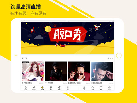 由多玩公司专为安卓平板用户开发的YY HD版,YYHD又称Pad版YY,YY直播HD专为平板设计,高清大屏极致体验,直播现场零距离,新鲜稀奇层出不穷,世界精彩由你探索!