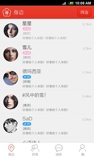 1.身边:基于手机定位,寻找身边的再婚人士,准确判定相隔距离,了解他并发起与他的聊天;