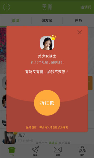 男神女神选中商品去广场发布任务,自有心仪你的TA为你买单。“非礼勿扰”的交友模式,既帮你过滤掉小气的TA,又体现出中华民族“礼仪之邦”的美称。