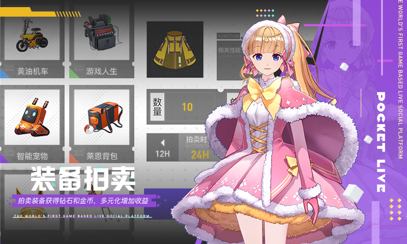 3、非常丰富的商城虚拟商品,里面设置了拍卖、装备以及道具等多种不同类别栏,还提供装饰、披风以及发行多种虚拟商品;