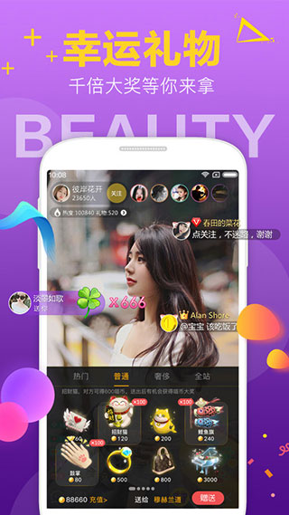 2、带有幸运的礼物,送礼物不仅能表达自己对主播的爱,还有机会获得上千倍的大奖;