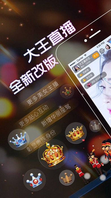大王直播间是一款全网少见的精彩福利聊天软件。在这里进行连麦互动,带来更多有趣的内容。增加华丽的坐席,显示王族特权,容易吸引女神的注意。奢华的礼物,精彩的展示,与众不同的大王待遇。古典喜剧团队打造爆笑直播盛宴。大王直播间官方网站下载就在yn下载站!