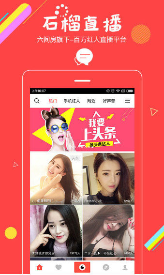 石榴直播间大厅是一款聚集可爱萌妹的手机直播社交平台。移动手机可以操纵观看视频的资源。通过主播的名字可以找到相应的直播内容,根据人气可以了解最热门的视频资源。体积小、速度快、绿色安装、广告屏蔽、安全保护。石榴直播老版本官方下载就在yn下载站!