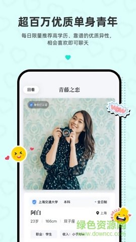 青藤之恋的诞生是为了解决与受过高等教育、素质高的年轻人交朋友的问题。在这里,所有用户都通过了实名和学历认证,手动可以查看相册和资料,确保了爱情和婚姻的严肃认证。越来越多的高素质年轻人在这里相遇、相识并坠入爱河。主动在这里找到自己最喜欢的人!