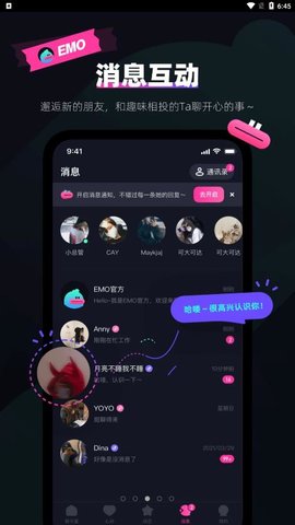 3、EMO派对语音匹配不仅可以交文字朋友,还可以交各种语音和视频,获得丰富的朋友模式。