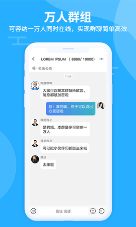 1、10000人团队:大团队的在线交流能力可达到10000人。同时,它还具有成员保护、匿名聊天等功能,保护群聊的安全。