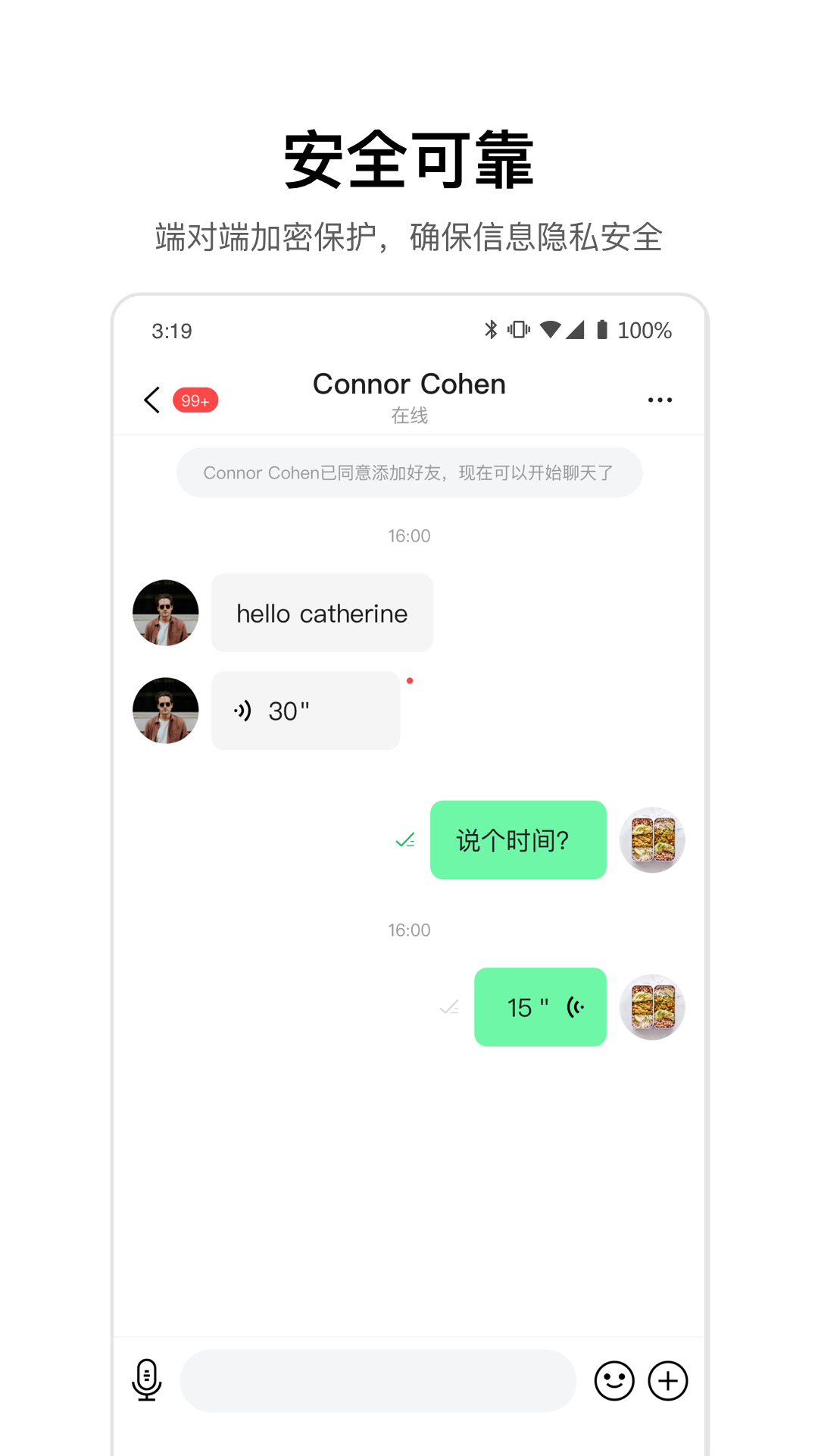 3.用户最私密的一些瞬间都在我们的聊天中分享,所以我们在应用中内置了端到端的加密技术。