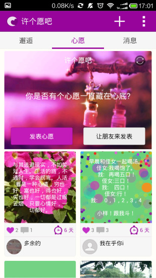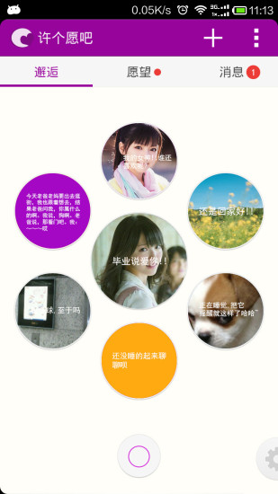 在许个愿吧这里,你可以找到ta;在这里说出你的心声,分享你的梦想;我们努力为你匹配一个能倾听你内心,能与你的梦想产生共鸣的TA。,在平台内尽情的探索交友的乐趣。还有机会结识到来自不同地区不同城市的新伙伴,认识更多有趣的新朋友。