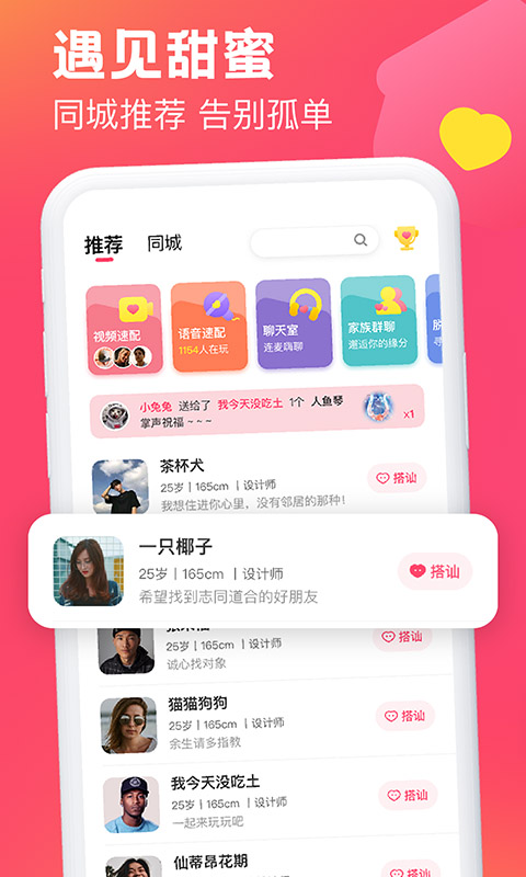 单身交友软件推荐是一款特别好用的交友软件,软件的使用者有很多,平台里的用户都是很优秀的,小哥哥小姐姐的颜值很高,你能够与他们进行有趣的互动,在这里你的交友变得更加简单。