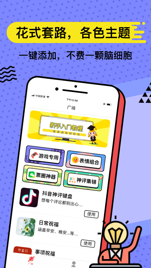 1、套路键盘,一款可以快速发送设定好内容的免打字的手机软件,一次设定好,再次使用点击直接发送即可。