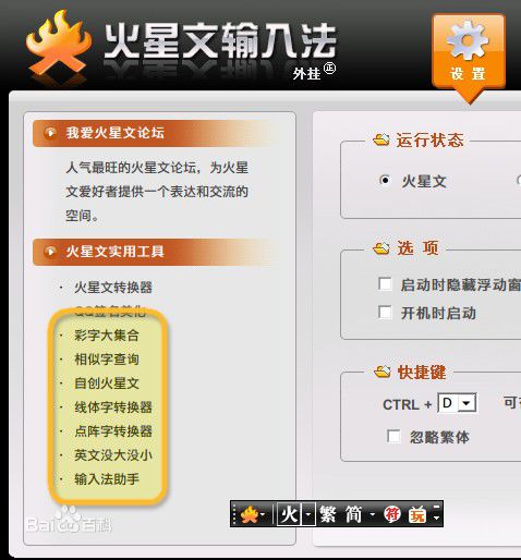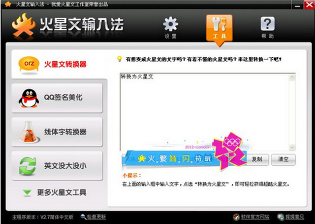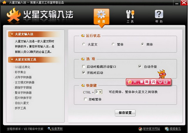 “火星文输入法”支持QQ、MSN、51挂挂等一切聊天工具,用于写呢称、换签名、玩游戏、顶贴子、踩博客。