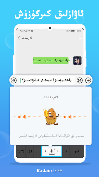 badam维语输入法最新版是一款实用的输入法软件,方便新疆的朋友们进行维语的输入交流,也方便喜欢维语的朋友们进行日常生活当中的学习。badam维语输入法下载安装后不仅支持打字输入,还支持语音和手写输入,结果准确误差率小,让用户能够加快自己的输入速度。