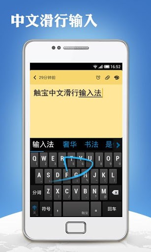 3、滑行输入:触宝中文滑行输入法app下载后用户可以不再使用点击字母而是滑行的模式来进行输入。
