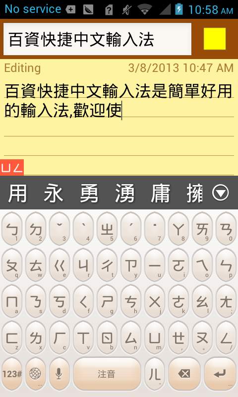 百资繁中输入法破解是一款非常好用的手机输入法软件,该软件为用户提供了简单舒适的繁体中文输入功能,百资繁中输入法app下载之后还提供了智能英文输入,中文手写,繁体和简体转换功能,提供简单的输入体验,提供智能的英文输入,中文手写输入,繁体中文注音输入,繁体中文快速输入,您可以通过多种方式输入传统字符,可以选择手写输入和其他不同需求,感兴趣的用户欢迎来yn下载站下载使用。