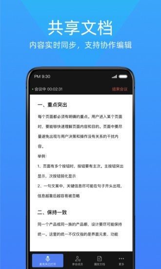 3.产品内支持多人语音通话、文档同步查看、文档协作编辑等强大功能。