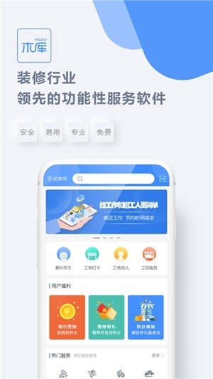 2.木库最新安卓版下载之后能够帮助装修行业快速找工作、招工人还有其他各种热门服务可以选择辅助办公,多方面管理工程施工和在线购买材料。