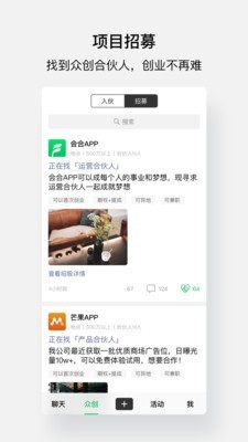 2.看项目的招募信息、看项目的资源,随时能参与招商活动,能实时的沟通的交友空间。