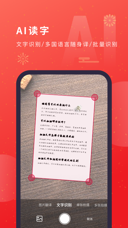 5.自动边缘检测,自动拍摄的高拍扫描仪,纸质文档清晰扫描电子化,快捷便携,轻松分享,口袋里的全能手机扫描仪。