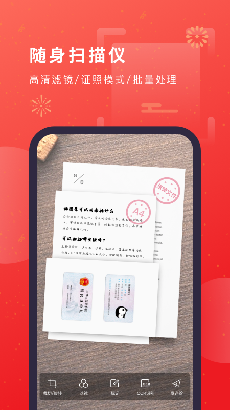 4. 扫描文档,快捷处理各类文档便于保存分类、管理和分享,支持扫描商业合同、商业文件、协议发票、身份证护照都可以进行扫描。
