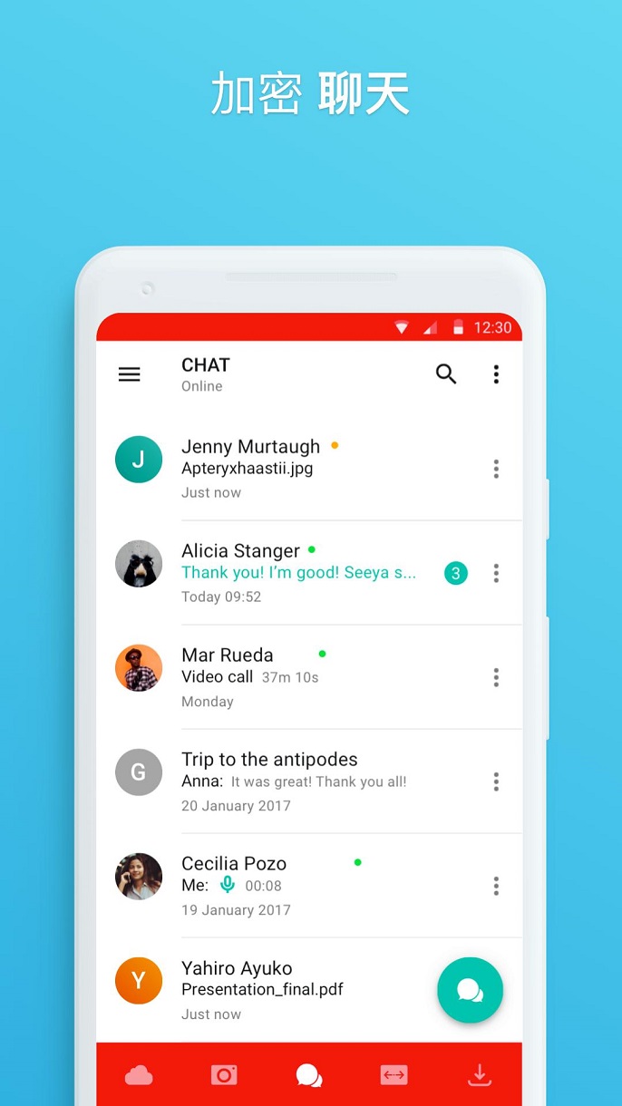 点对点用户加密的MEGA视讯聊天功能确保完全的隐私,自2016年起可透过浏览器使用。该功能现已扩及至我们的行动应用程式,可透过多个装置检视聊天记录。用户还可透过MEGA云端硬碟轻松将档案添加到聊天中。