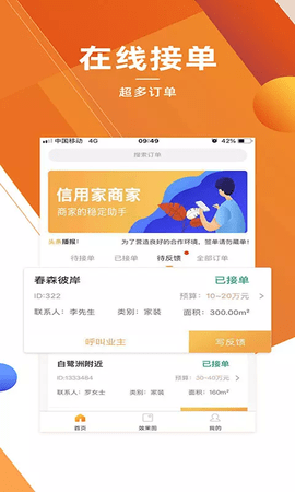 信用家商家版app是专门为装饰平台商家打造的移动工具,可以让装饰公司轻松接收订单、查看订单、处理订单业务,有效帮助装饰公司提高工作效率、提升业绩。信用之家互联网装饰平台邀请装饰公司进入,立即打开订单获利。