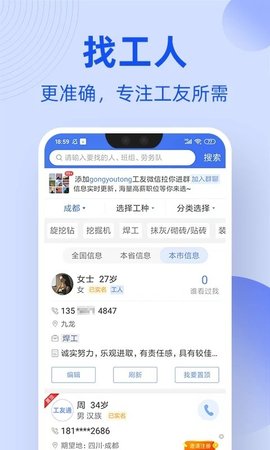 工友通app为用户提供了非常高质量的信息。员工可以根据地区在附近找到工作。雇主还可以在网上发布自己的招聘信息,帮助施工老板轻松找到合适的工人,大大提高老板的招聘效率。