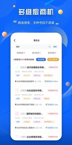 行业信息和客户源收集应用,我们的目标是帮助用户搜索有价值的企业和商家等客户信息和商机信息,更好的帮助实体业主和企业主营销推广。